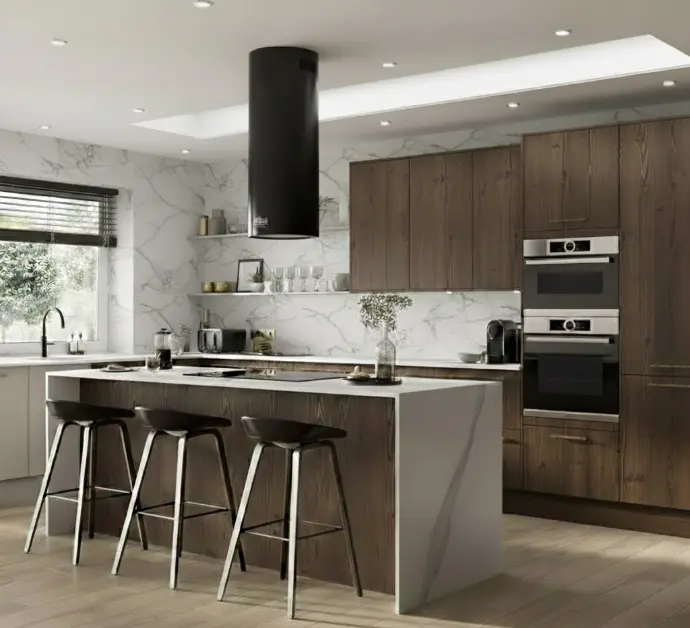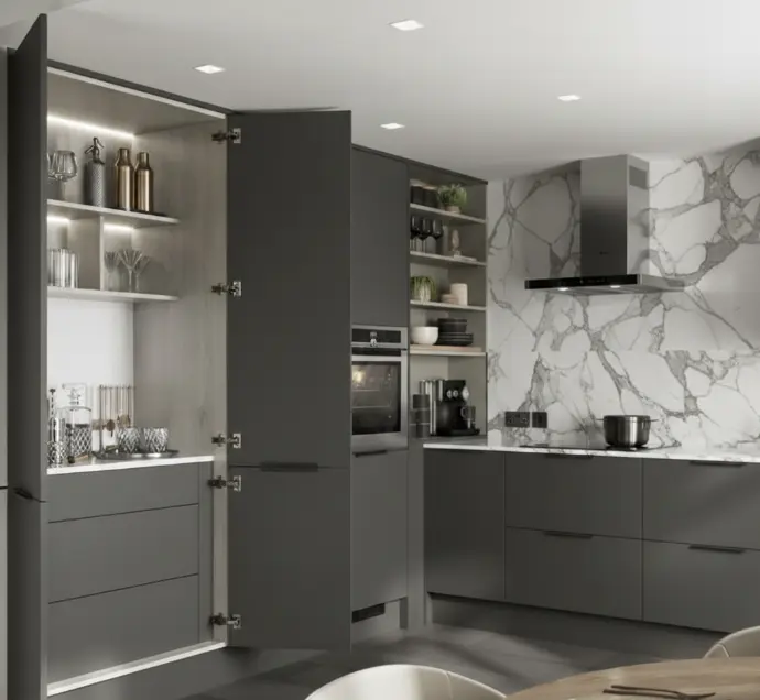 O bucătărie modernă, cu combinații de linii drepte și materiale noi, care ține pasul cu ritmul rapid al vieții de astăzi și poate fi personalizată pentru a satisface nevoile specifice ale stilului de viață.