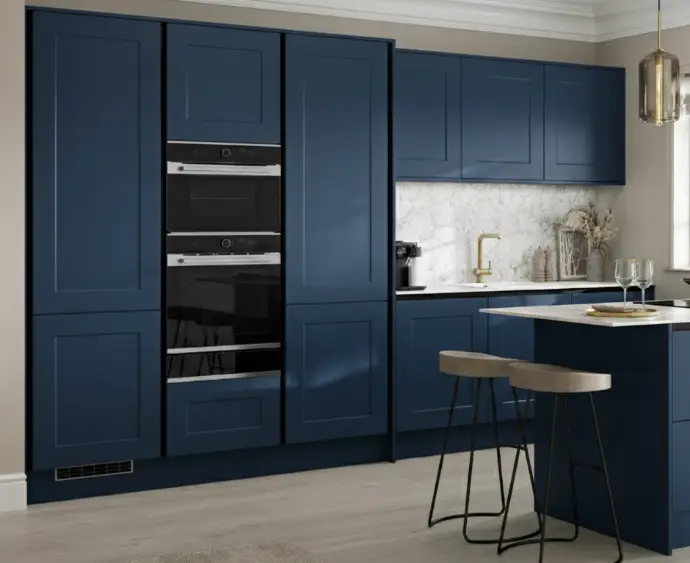 Combină nuanțele îndrăznețe de albastru cu dulapurile contemporane, optând pentru aceste corpuri de mobilier fără mânere. Cu o ramă lată și un finisaj neted, această ușă de dulap oferă o abordare modernă a aspectului shaker, fiind o alegere excelentă pentru un design fără mânere.